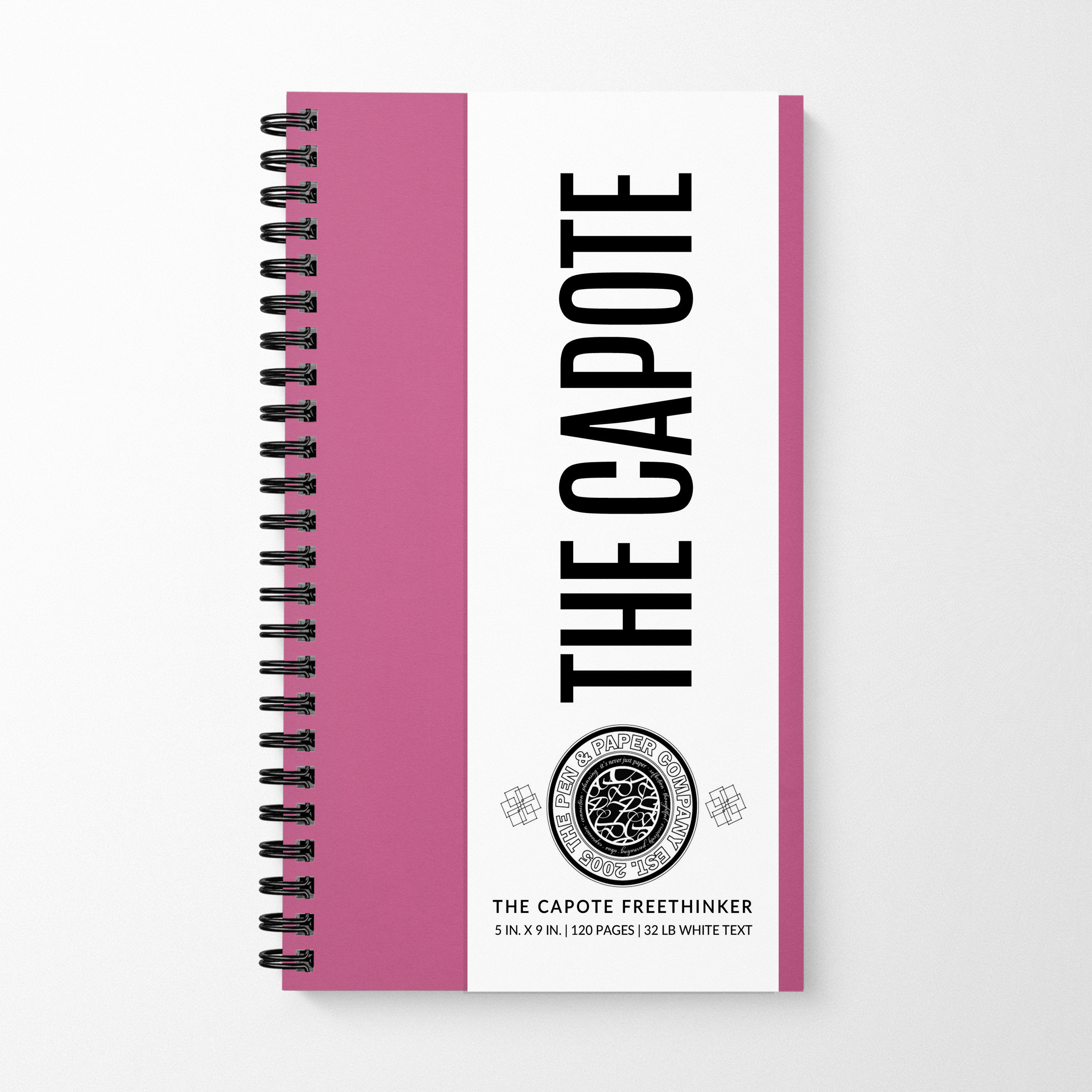 The Capote Freethinker will fit in your backpack, purse, or messenger bag. It is 5 in. x 9 in. and can be crafted with almost any color cover you like. The default paper is 80 lb. premium text which is great for avoiding pesky bleed through. However, you can choose any smooth text stock between 60 lb. – 100 lb.