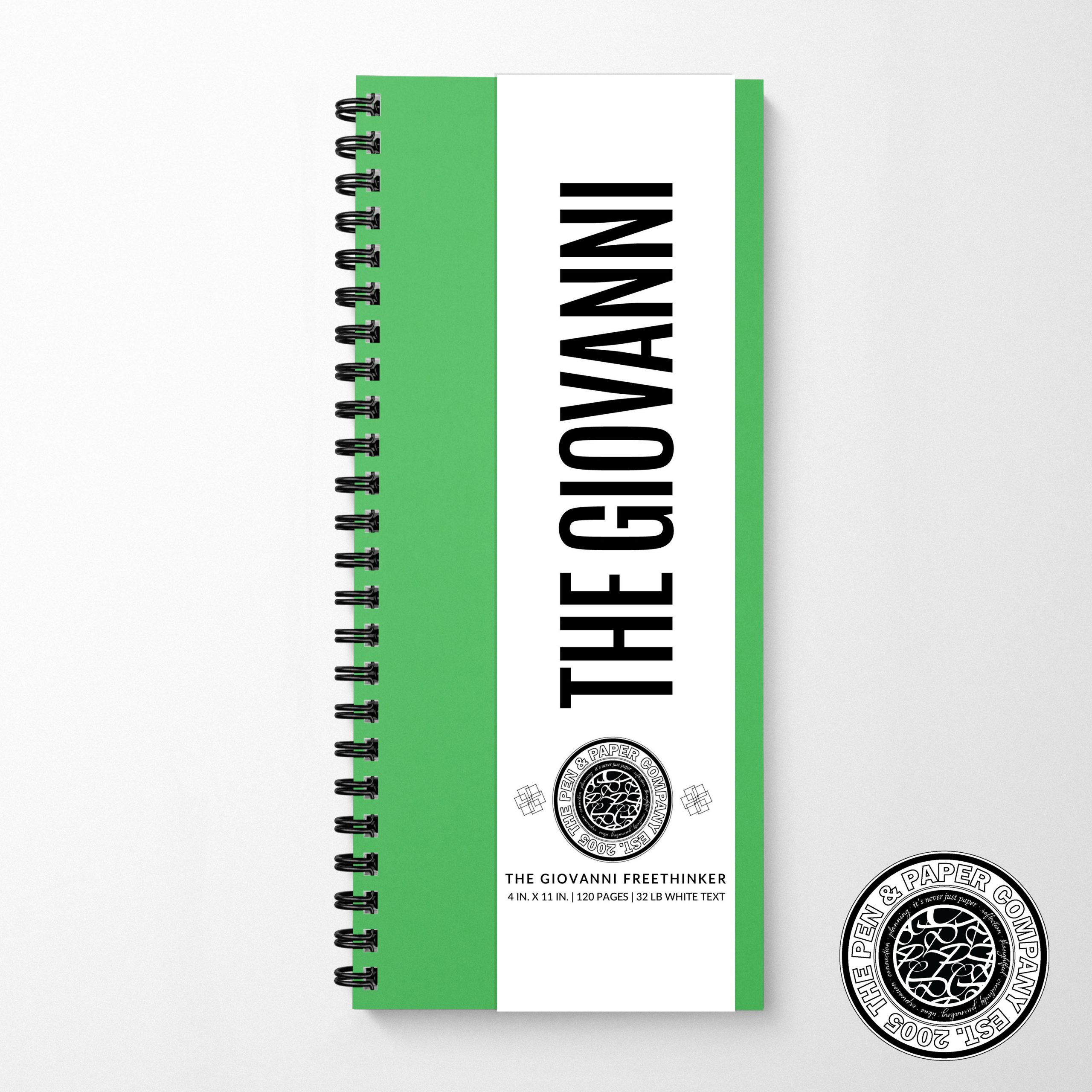 The Giovanni Freethinker is the slimmest freewriting notebook and it is PERFECT for lists. It is 4 in. x 11 in. and can be crafted with almost any color cover you like. The default paper is 80 lb. premium text which is great for avoiding pesky bleed through. However, you can choose any smooth text stock between 60 lb. – 100 lb.