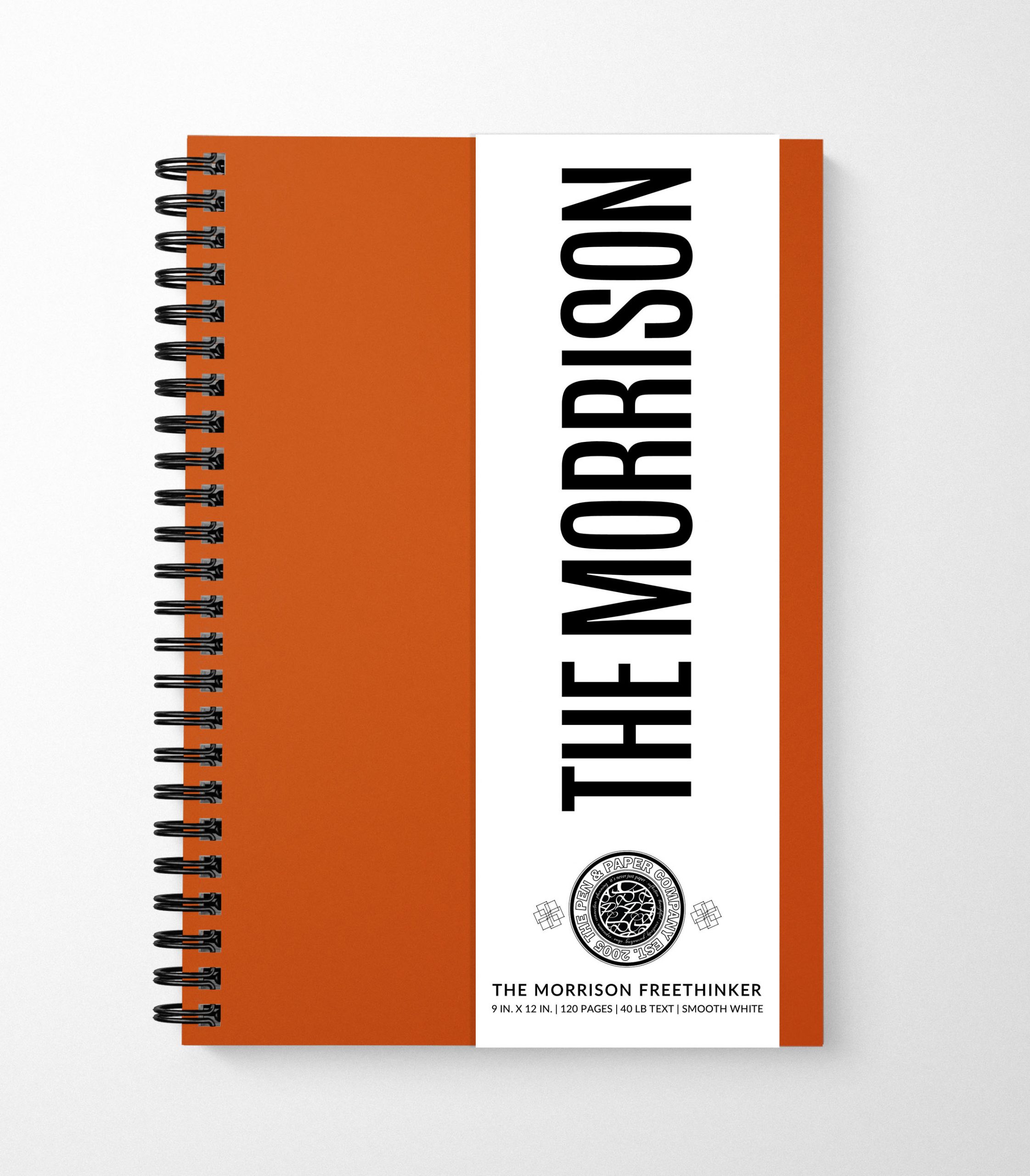 The Morrison Freethinker is our largest freewriting notebook. It is 9 in. x 12 in. and can be crafted with almost any color cover you like. The default paper is 80 lb. premium text which is great for avoiding pesky bleed through. However, you can choose any smooth text stock between 60 lb. – 100 lb.
